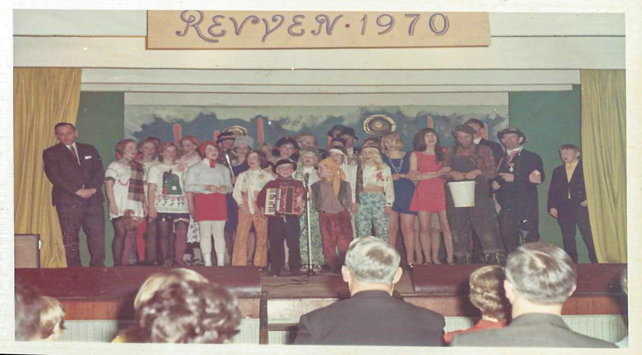 Fotografen er fru Laumann, da Flemming Laumann selv var med i Revyen. Han og glarmester Verner Fich Rasmussen, Jernhandler Søren Thomsen, Hans Holdensen, Stejlgård, var gårdsangere. Slagtemester Valde sang en sang om at se det hele lidt fra oven, mens Købmand Tot blev trukket tværs over scenen hængende som en flyvende gåsedreng. Den lille dreng med harmonikaen er kapelmesterens søn, der var malermester Polle. Konferencier er Holger Sørensen. Instruktør var Ulrichs og sufflør hans kone Ingrid, tidl. telefoncentralbestyrer i Bramming. Som det fremgår af foto var mange med. Kate Kaa stod for dansenumrene!