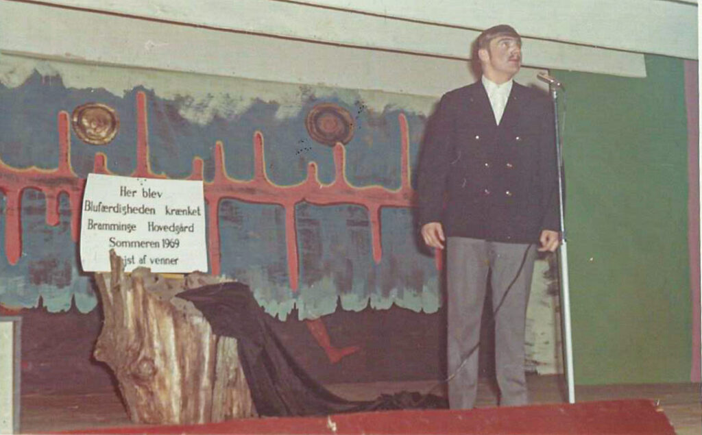 Jeg sang et nummer, skrevet af Harry Gustavsen om Paul Lund Bramming Hovedgård, der kæmpede indædt mod pornoens frigivelse og rejste en skamstøtte i parken på Bramming Hovedgård. Det er den skiltet referer til. (Se nederst på siden, “da pornoen blev fri”)